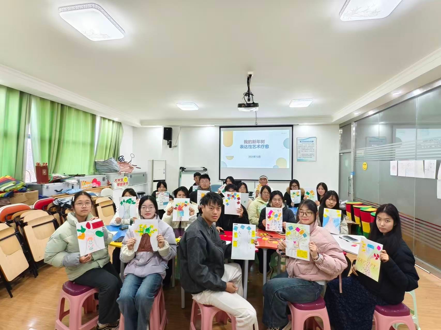 12月30日下午,学工处心理咨询中心在大学生活动中心304举办了一场别开生面的心理疗愈活动——“我的新年树”表达性艺术工作坊。本次活动由心理咨询中心郭琼老师带领,吸引来自各二级学院的20名同学积极参与。